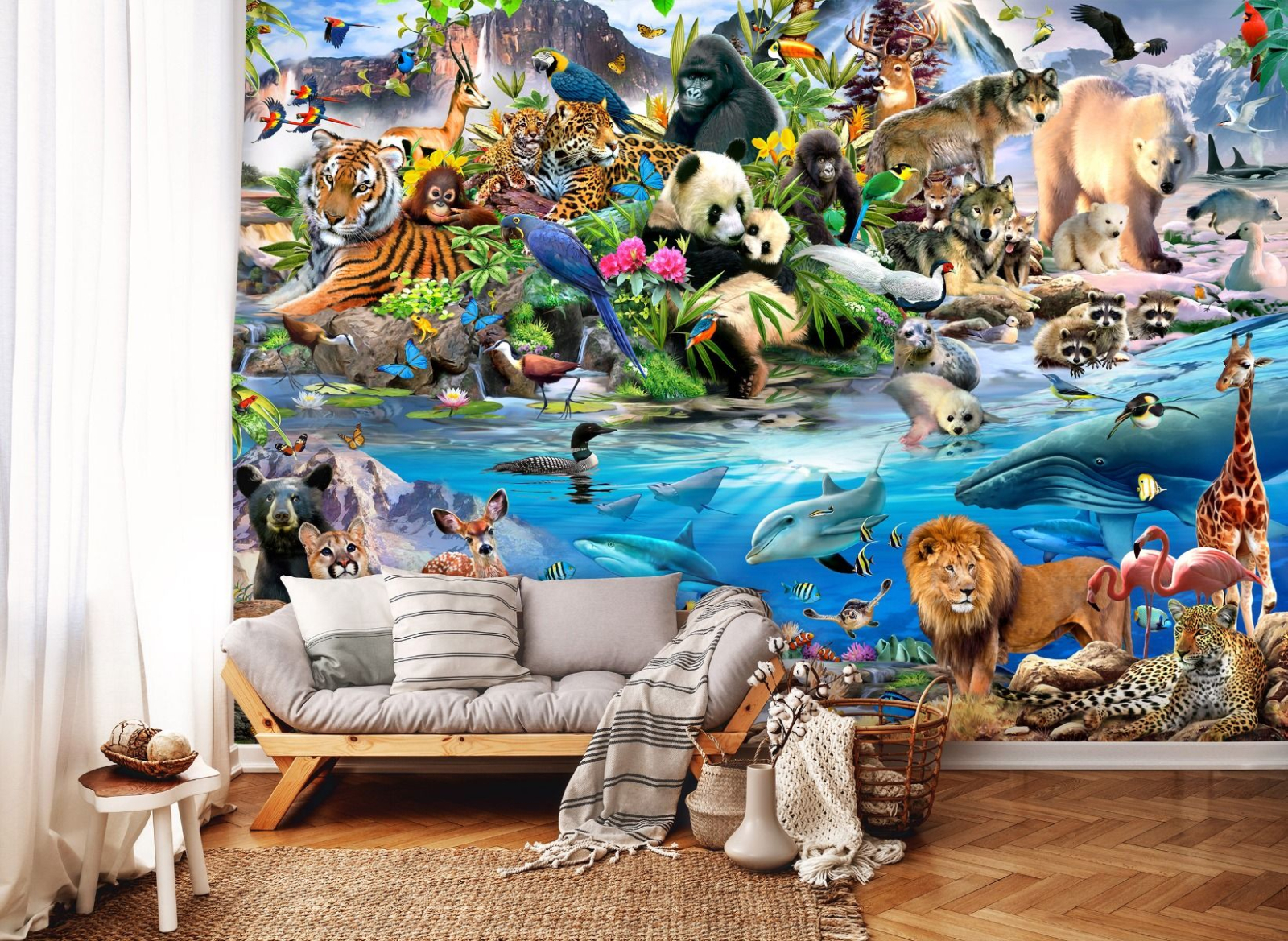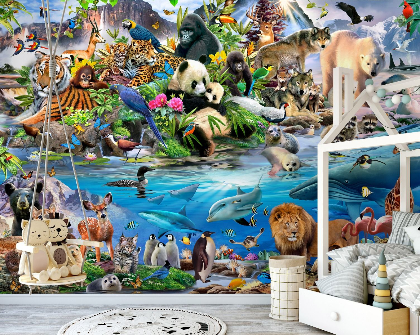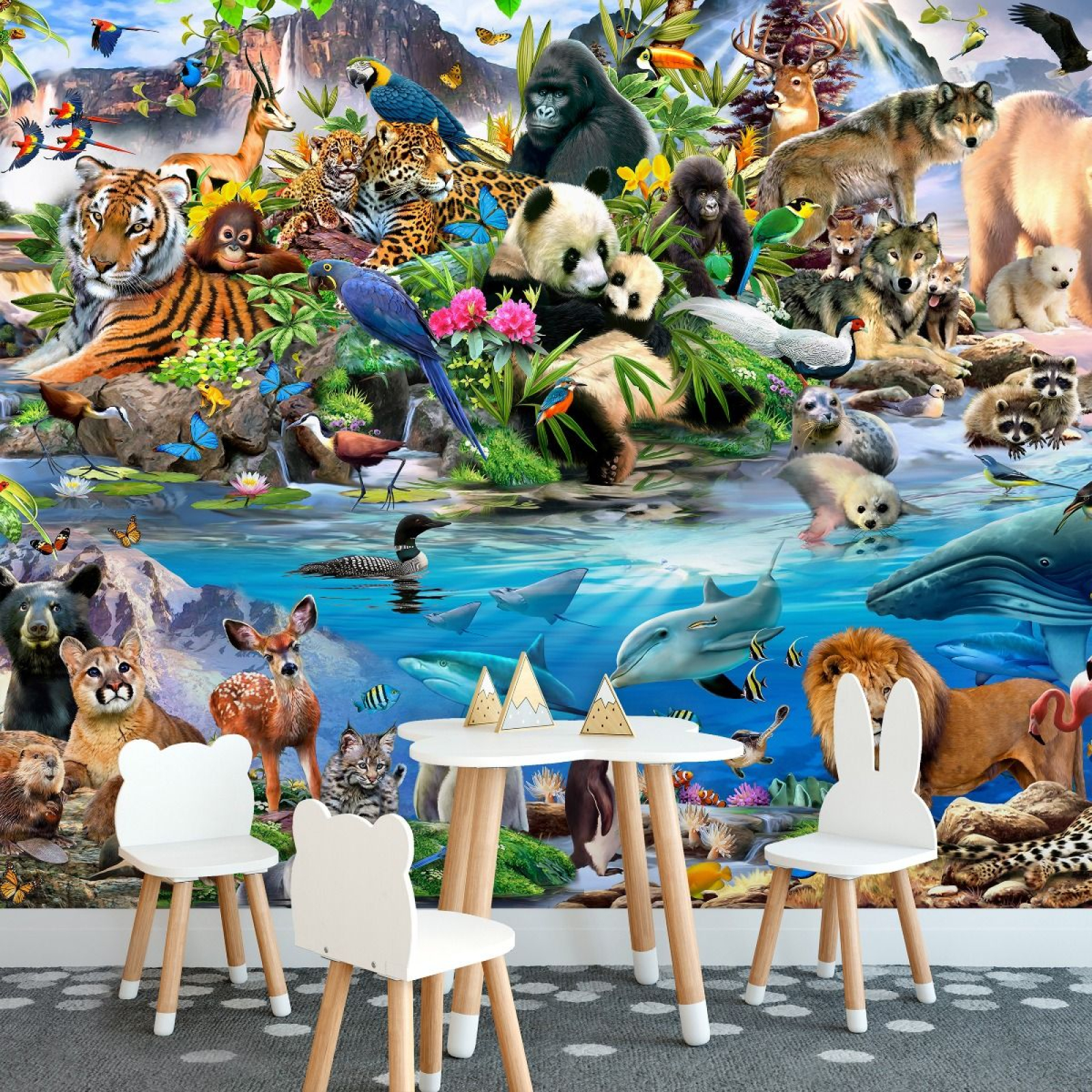 Пейзажът е изпълнен с хармония, а цветовете – нежно преливащи, създават усещане за спокойствие и уют. Високо в небето черни силуети на птици добавят усещане за свобода и движение. Планините в далечината, обагрени в меки сини и снежнобели нюанси, придават дълбочина на картината и внушават чувство за безкрайни възможности. Фототапетът е идеален за детска стая, като стимулира въображението, създава топла и приказна атмосфера и насърчава любовта към природата и животните.