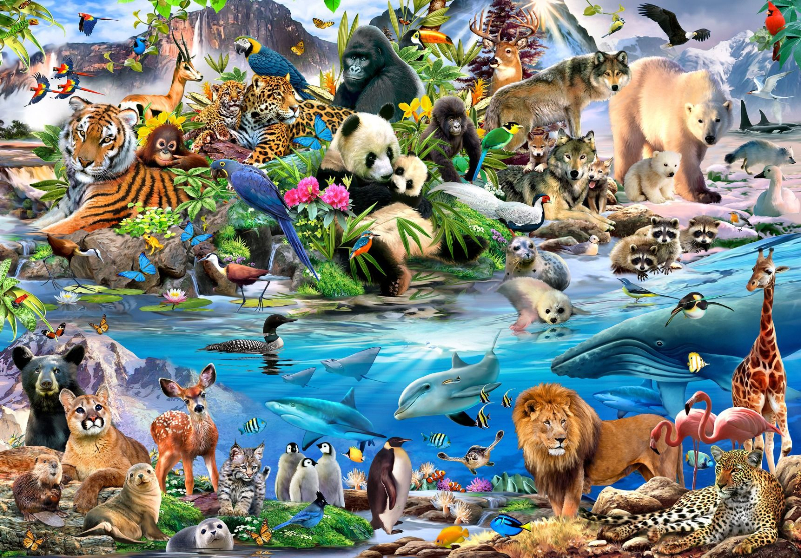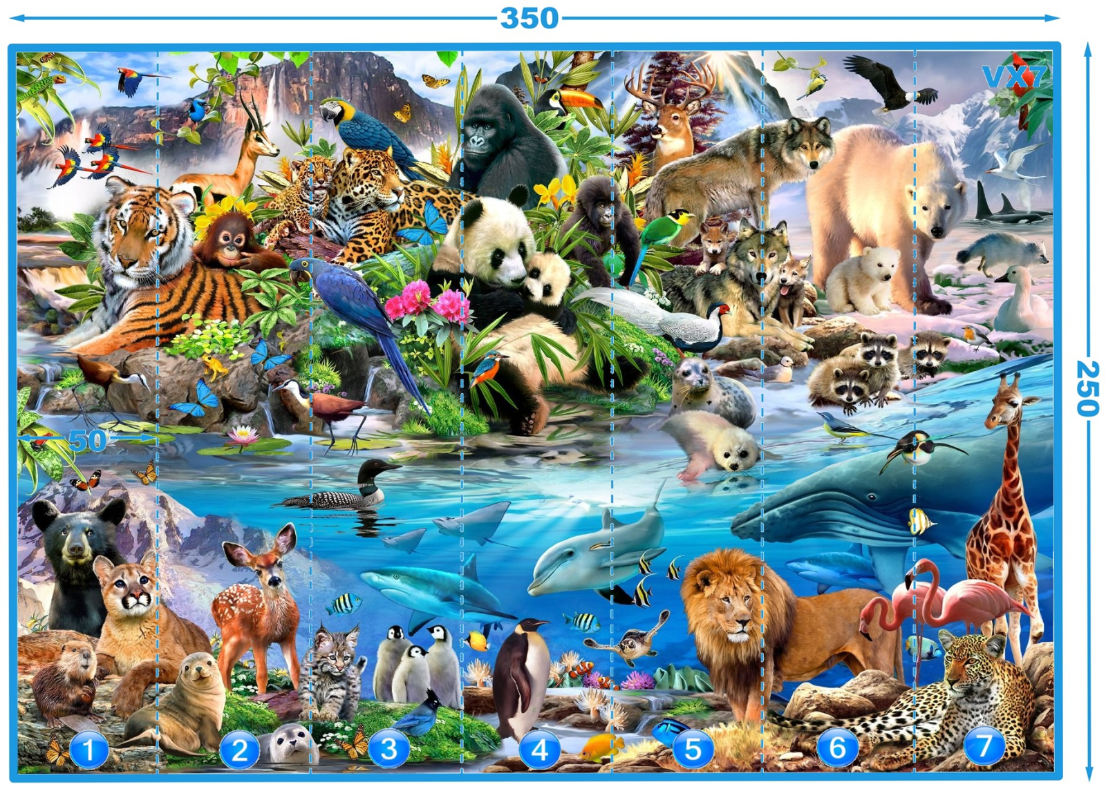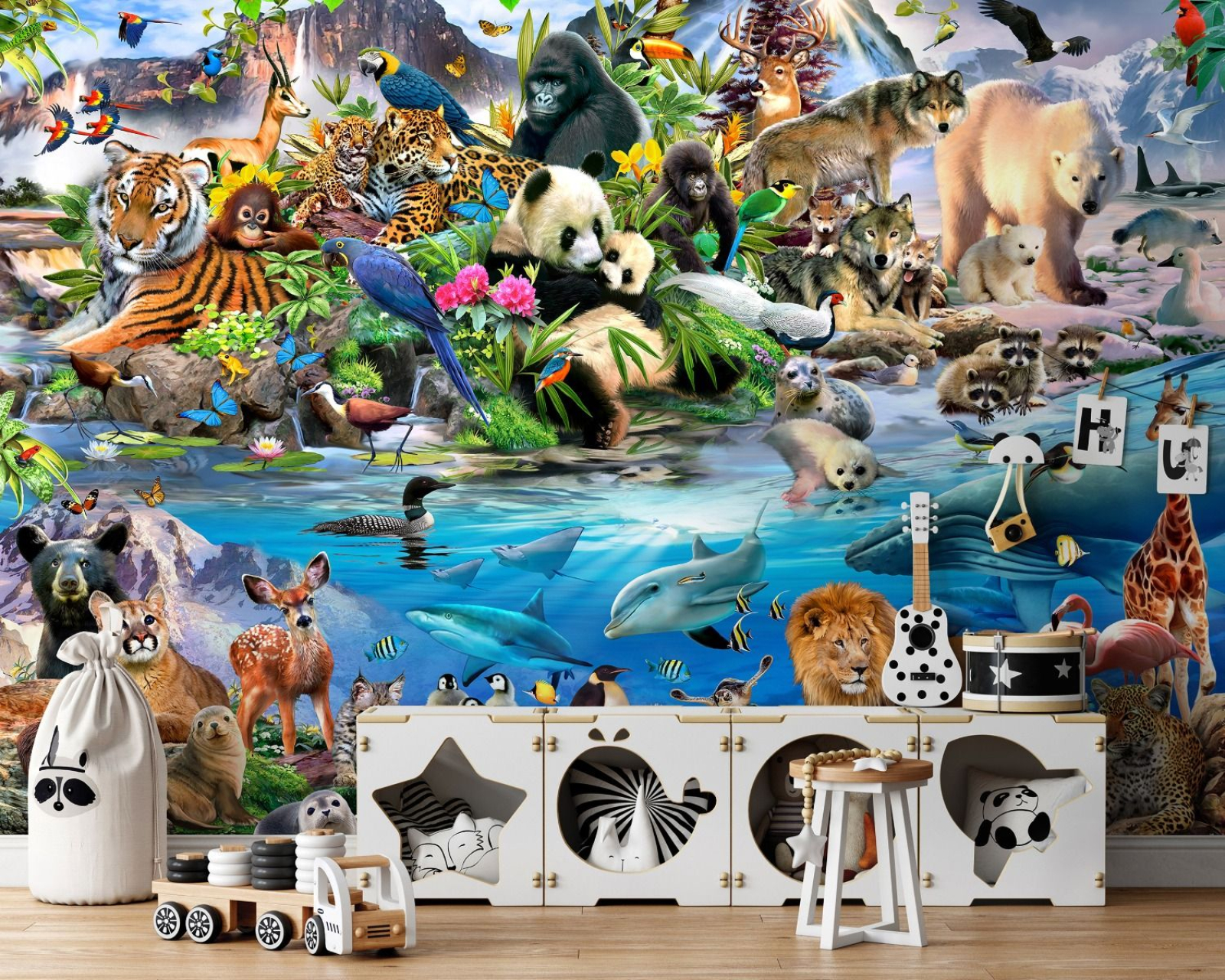 Пейзажът е изпълнен с хармония, а цветовете – нежно преливащи, създават усещане за спокойствие и уют. Високо в небето черни силуети на птици добавят усещане за свобода и движение. Планините в далечината, обагрени в меки сини и снежнобели нюанси, придават дълбочина на картината и внушават чувство за безкрайни възможности. Фототапетът е идеален за детска стая, като стимулира въображението, създава топла и приказна атмосфера и насърчава любовта към природата и животните.