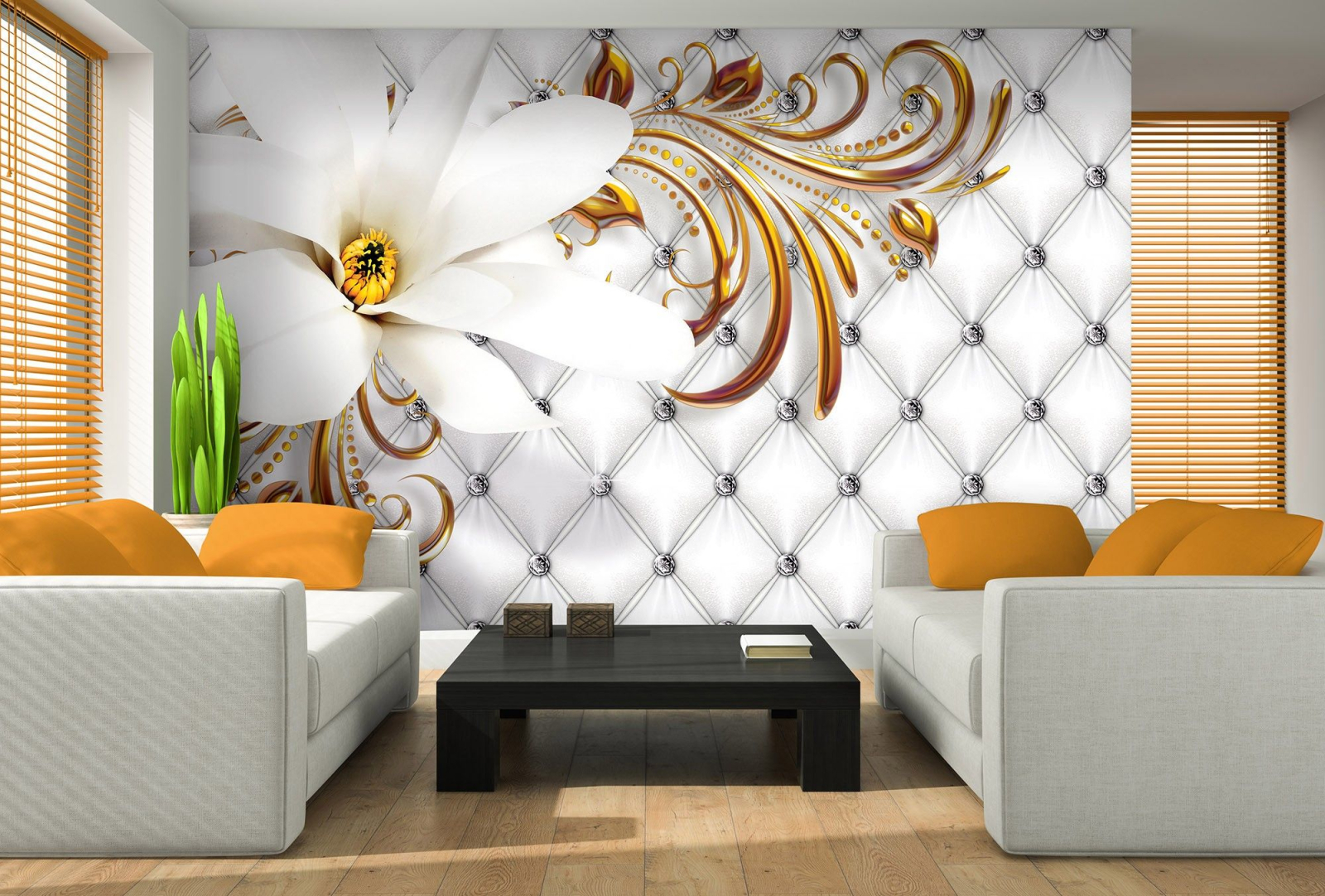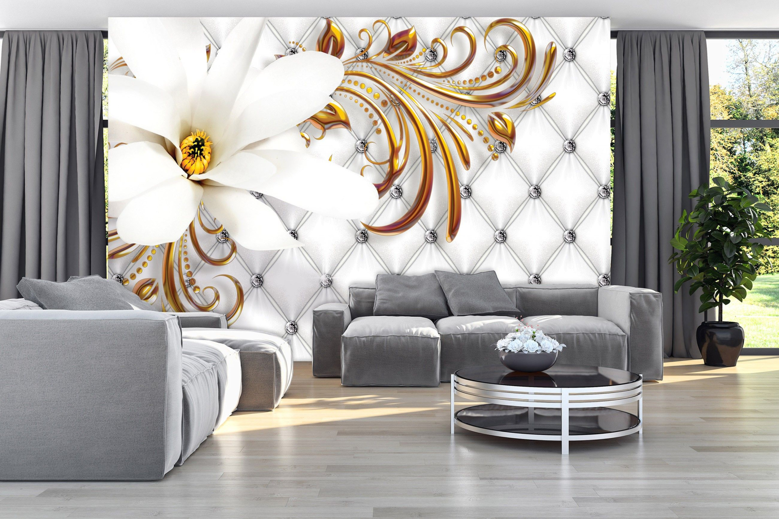 Флис Фототапет 3D Бяло цвете, златни листа