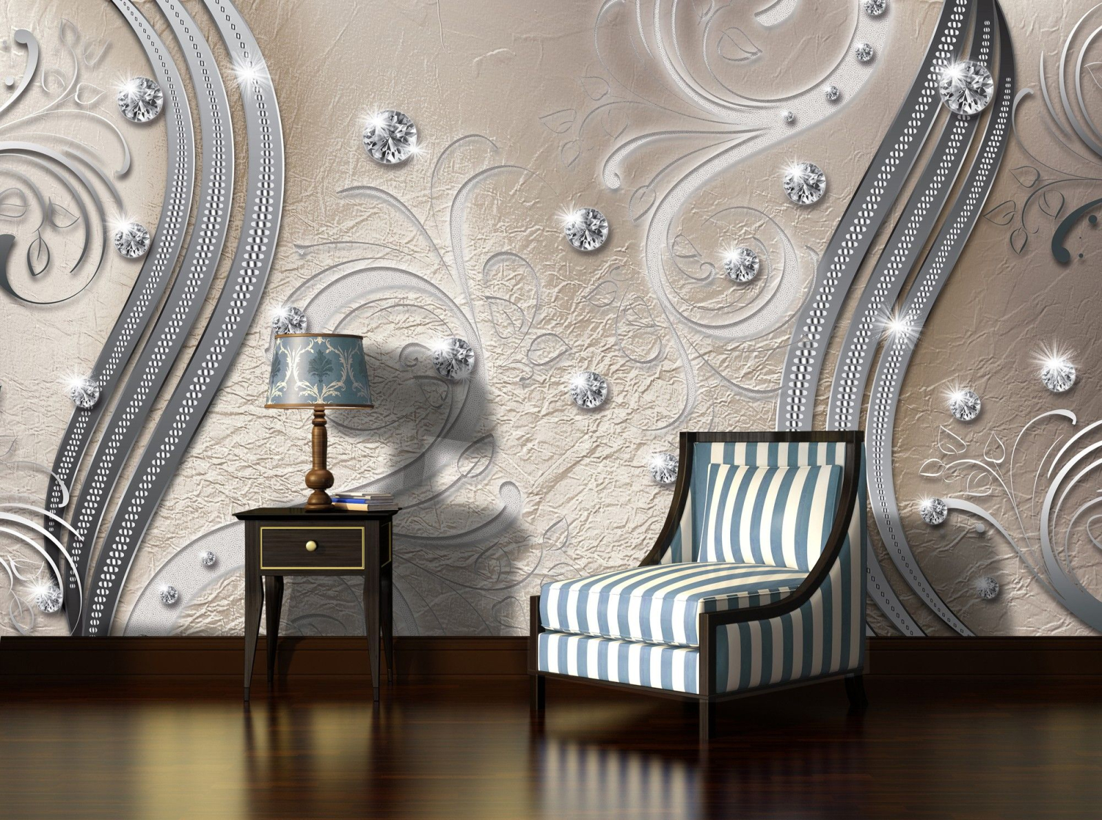 Флис Фототапет 3D Метални орнамени, кристали и диаманти, сиво-бежово