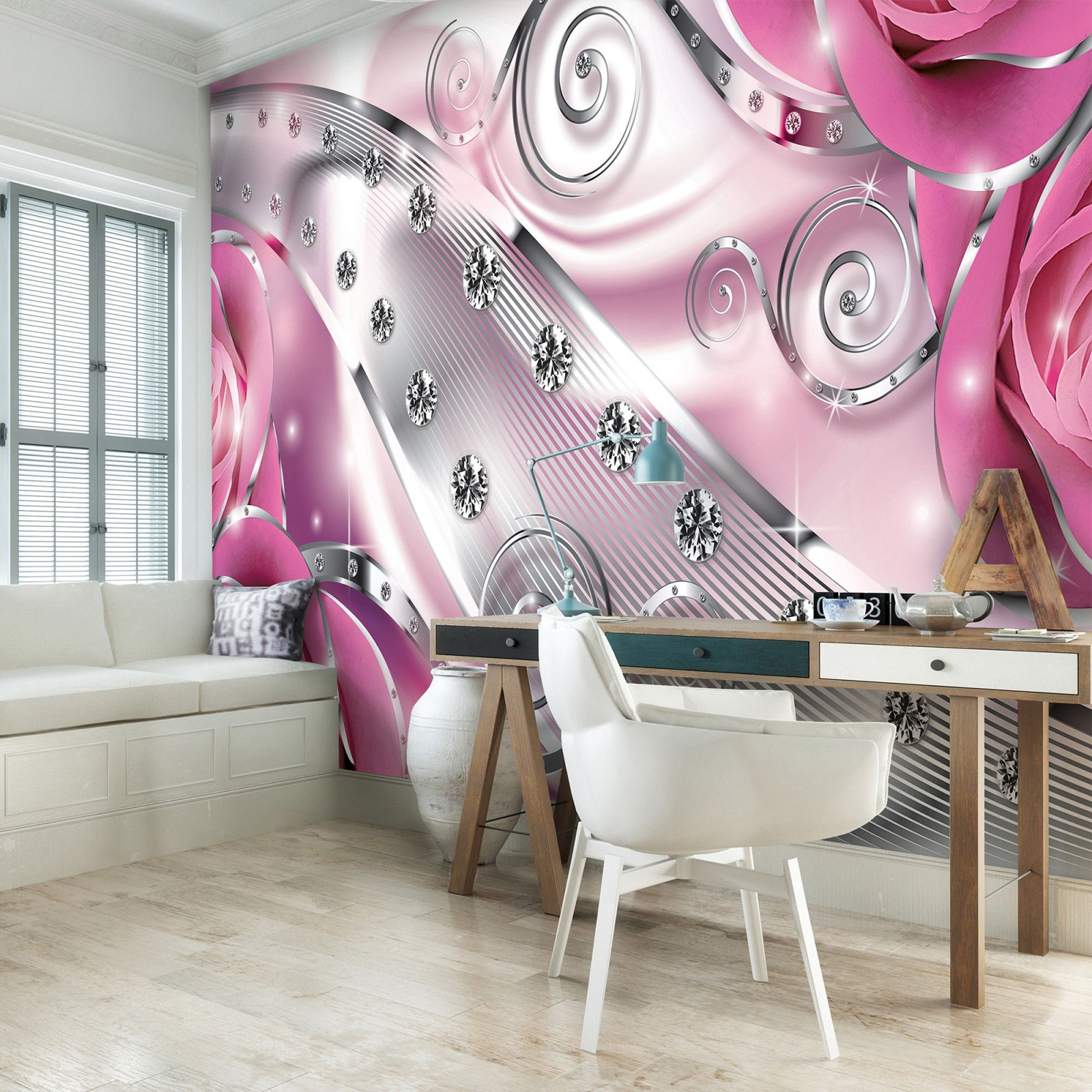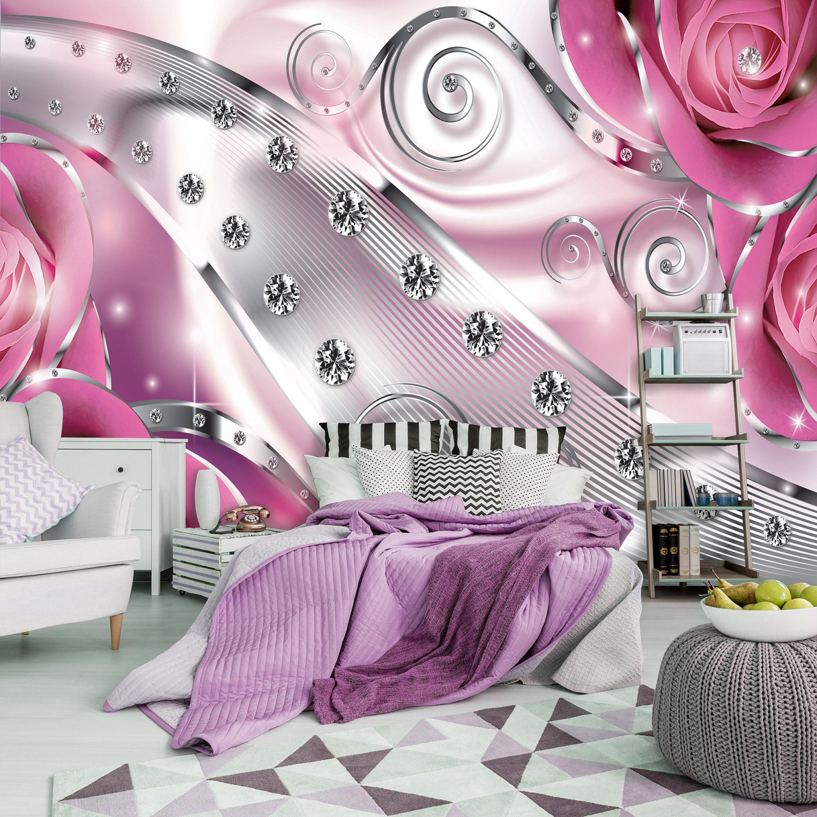 Флис Фототапет 3D орнаменти с рози и диаманти, розово
