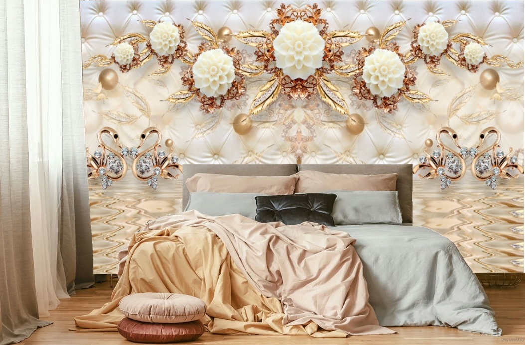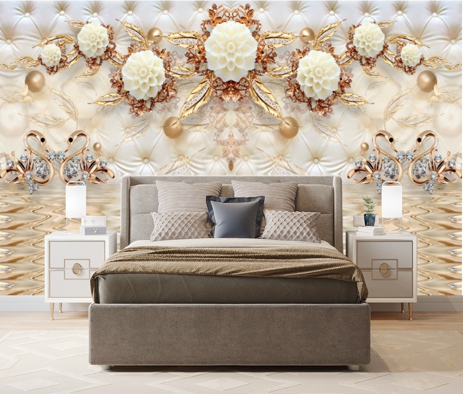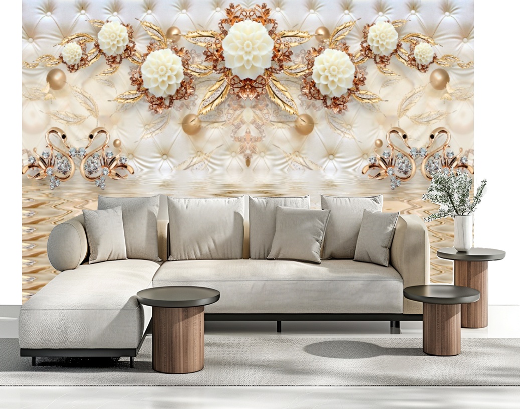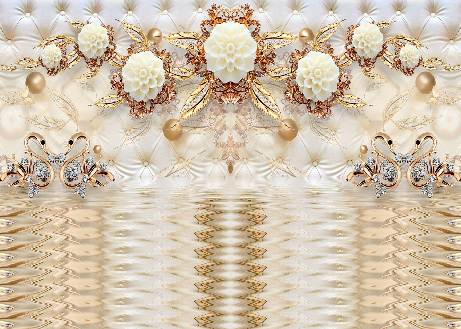 Флис Фототапет Красиви цветя и лебеди-3D композиция