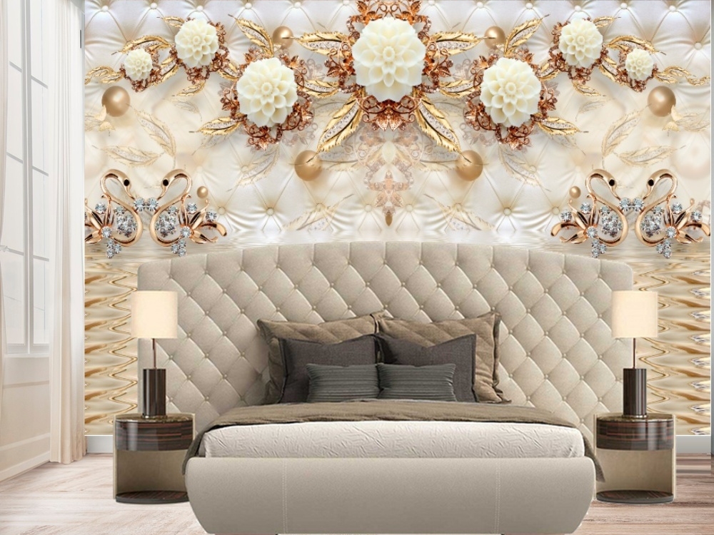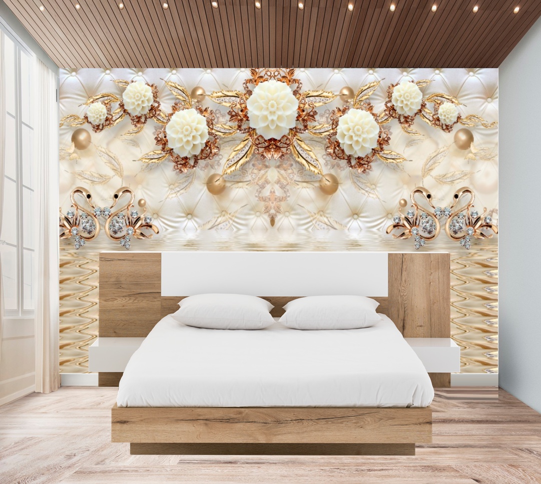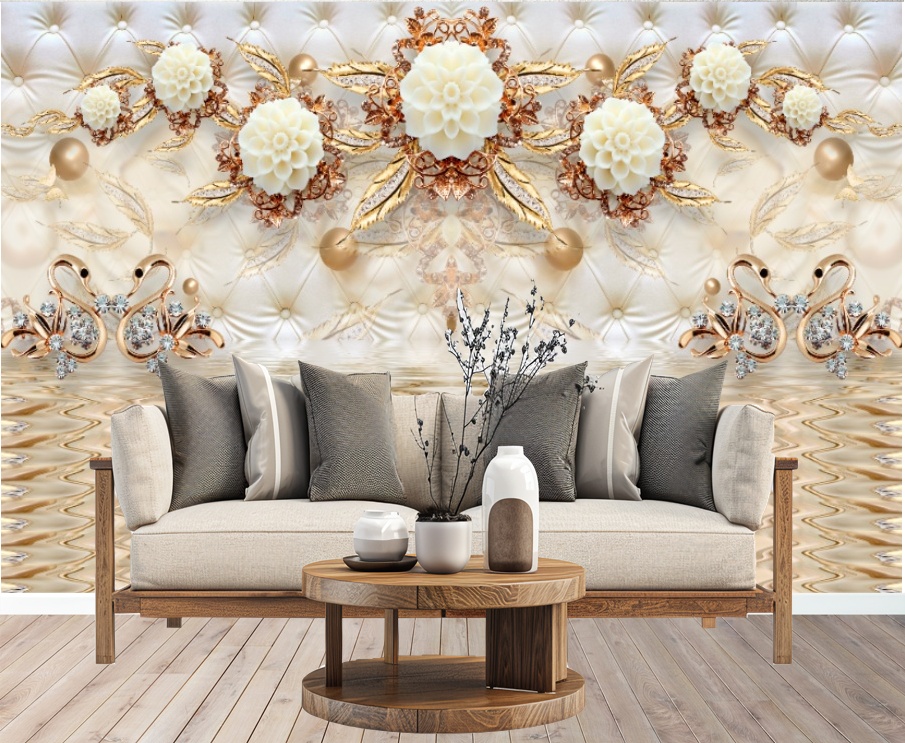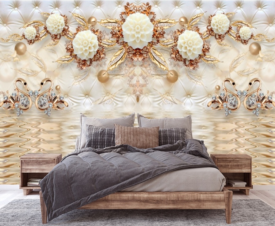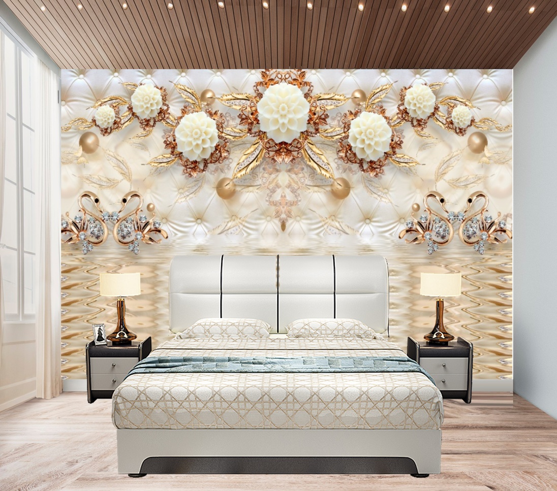 Флис Фототапет Красиви цветя и лебеди-3D композиция
