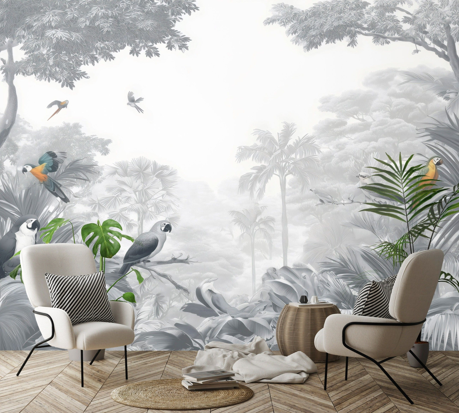Флис Фототапет Папагали и дървета, рисувани, бохо стил