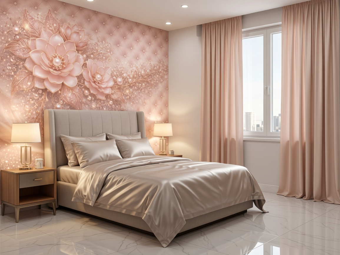 Изискан фототапет с розово-златни цветя, перли и фин блясък, който съчетава романтика и лукс в едно впечатляващо декоративно решение. Подходящ за спалня, дамски интериор, хотел или салон за красота с елегантно излъчване.