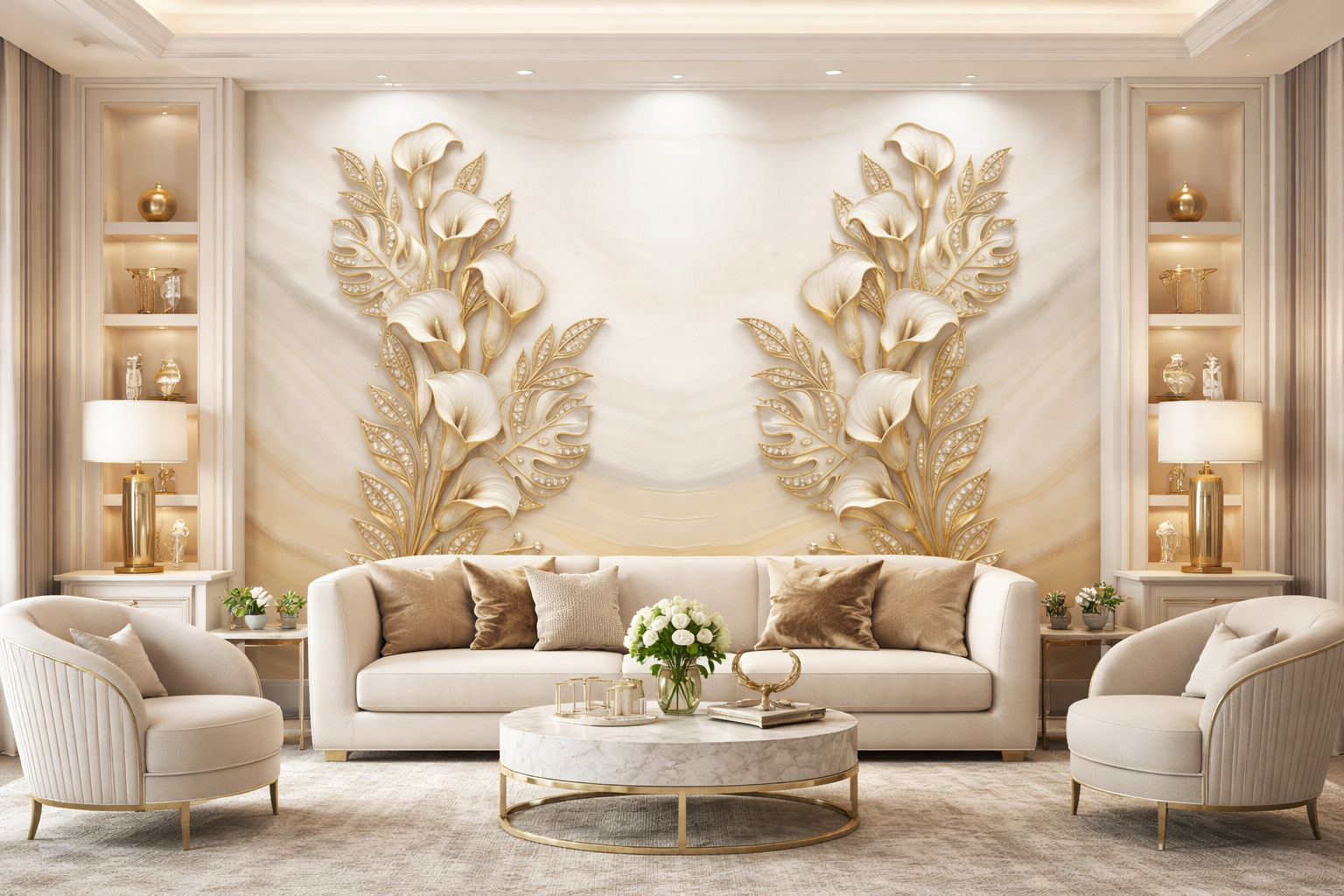 Елегантен луксозен фототапет със златни калии и фина симетрична композиция върху мек светъл фон. Създава усещане за баланс, светлина и изискан лукс, подходящ за спалня, хол или стилен хотелски интериор.