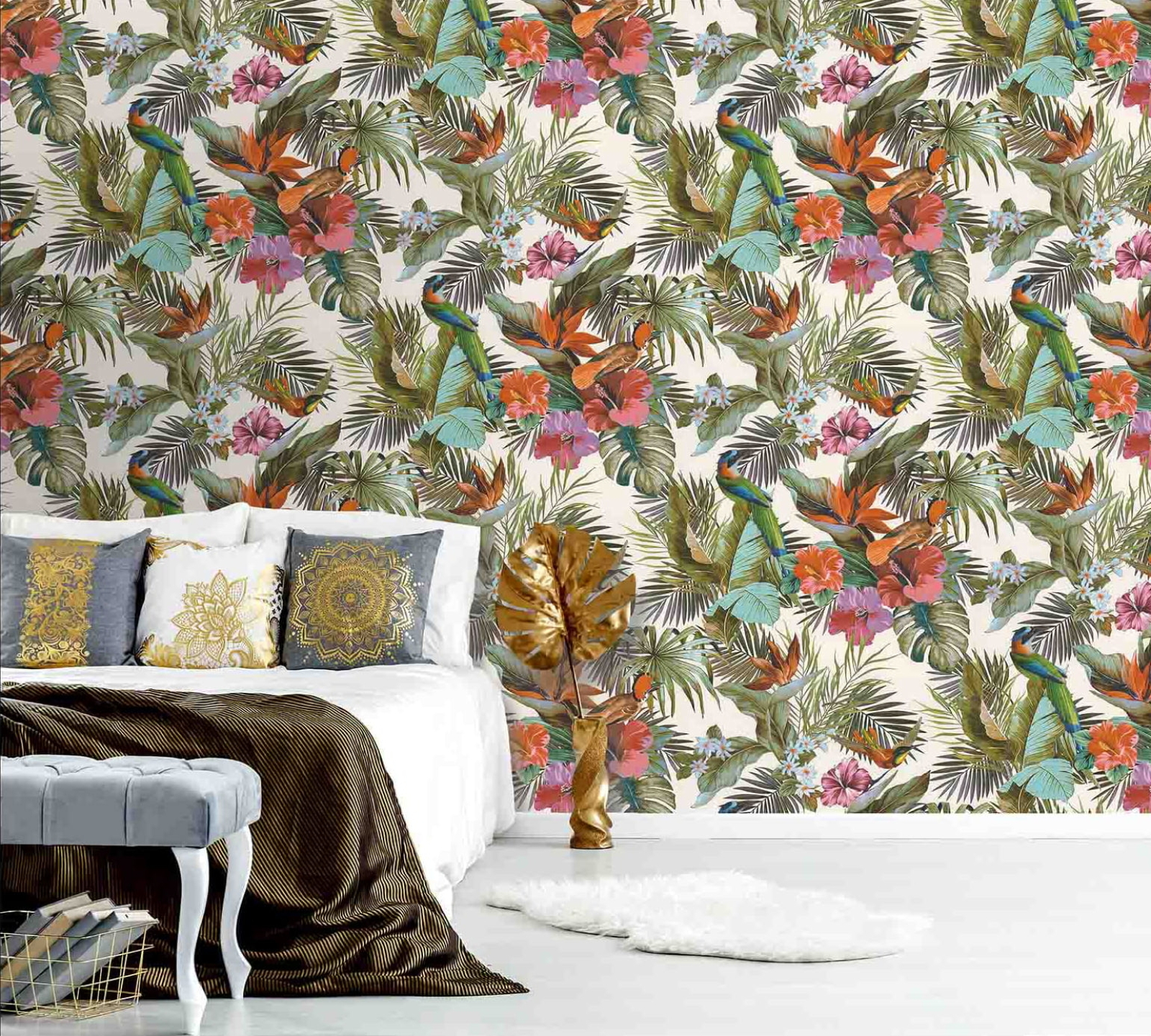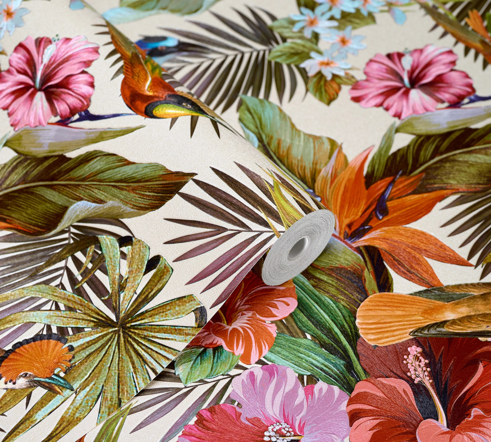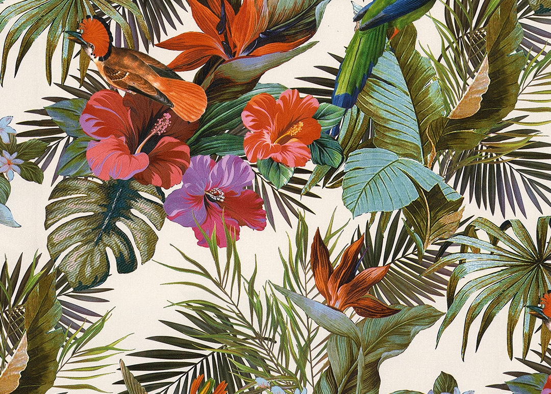 Тапет тежък винил на флис основа, Птици и цветя от Джунглата, фон-бял
